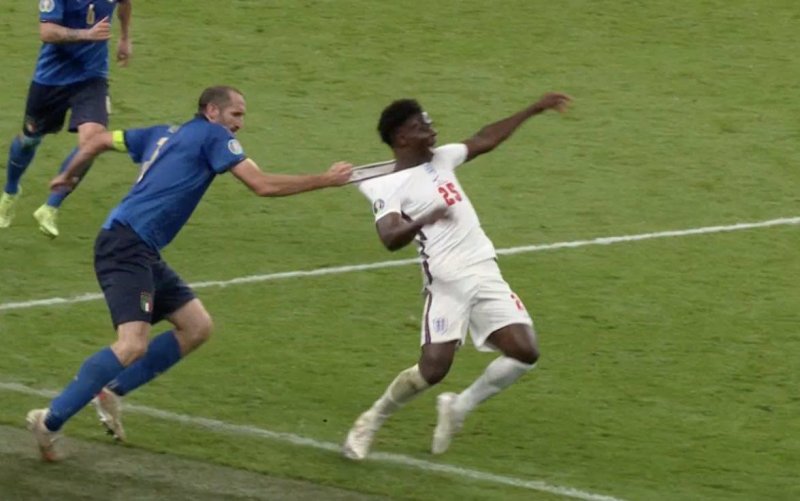 در حالی که بازی به لحظات پایانی خود در وقتهای قانونی نزدیک می شد، باکایو ساکا یک فرار بسیار خوب را از جناح راست ترتیب داد که البته اشتباه محاسباتی کیهلینی نیز در آن تاثیر گذار بود. با این حال کاپیتان تیم ملی ایتالیا مجبور شد با یک خطای عجیب ساکا را متوقف کند و به نوعی او را بغل کرد و یک کارت زرد را به جان خرید. در واقع شاید اگر این خطا از سوی کیه لینی رخ نمیداد، انگلیس می توانست به برتری را به ثمر برساند تا اصلاً کار به وقتهای اضافه کشیده نشود.