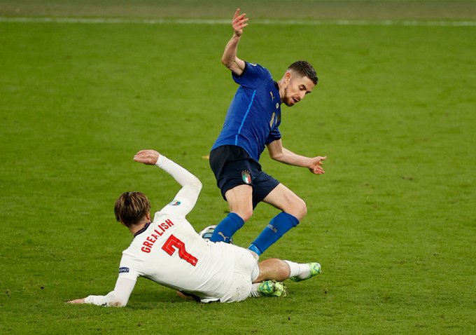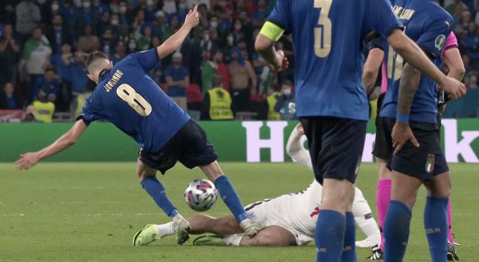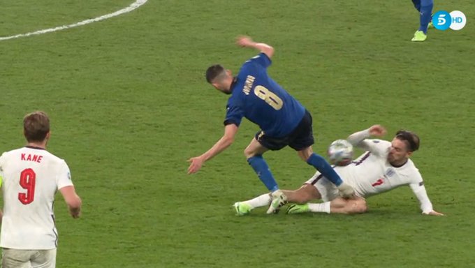 دقیقه 113 بازی جورجینیو هافبک ایتالیا با کف پا روی ران پای جک گریلیش رفت و ستاره سه شیرها را مصدوم کرد. گریلیش از درد به خود می پیچید اما بیورن کوئیپرس داور هلندی در نهایت تنها به دادن یک کارت زرد به جورجینیو کفایت کرد.