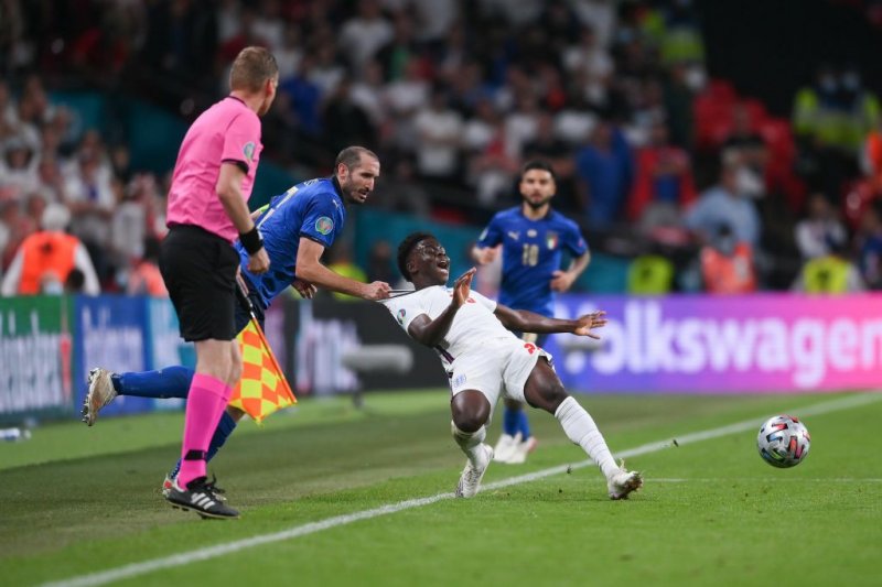 به گزارش "ورزش سه"، در حالی که بازی فینال یورو به لحظات پایانی خود در وقتهای قانونی نزدیک می شد، باکایو ساکا یک فرار بسیار خوب را از جناح راست ترتیب داد که البته اشتباه محاسباتی کیهلینی نیز در آن تاثیر گذار بود. با این حال کاپیتان تیم ملی ایتالیا مجبور شد با یک خطای عجیب ساکا را متوقف کند و به نوعی با کشدیدن پیراهن او، به این بازیکن اجازه حرکت نداد و یک کارت زرد را به جان خرید.