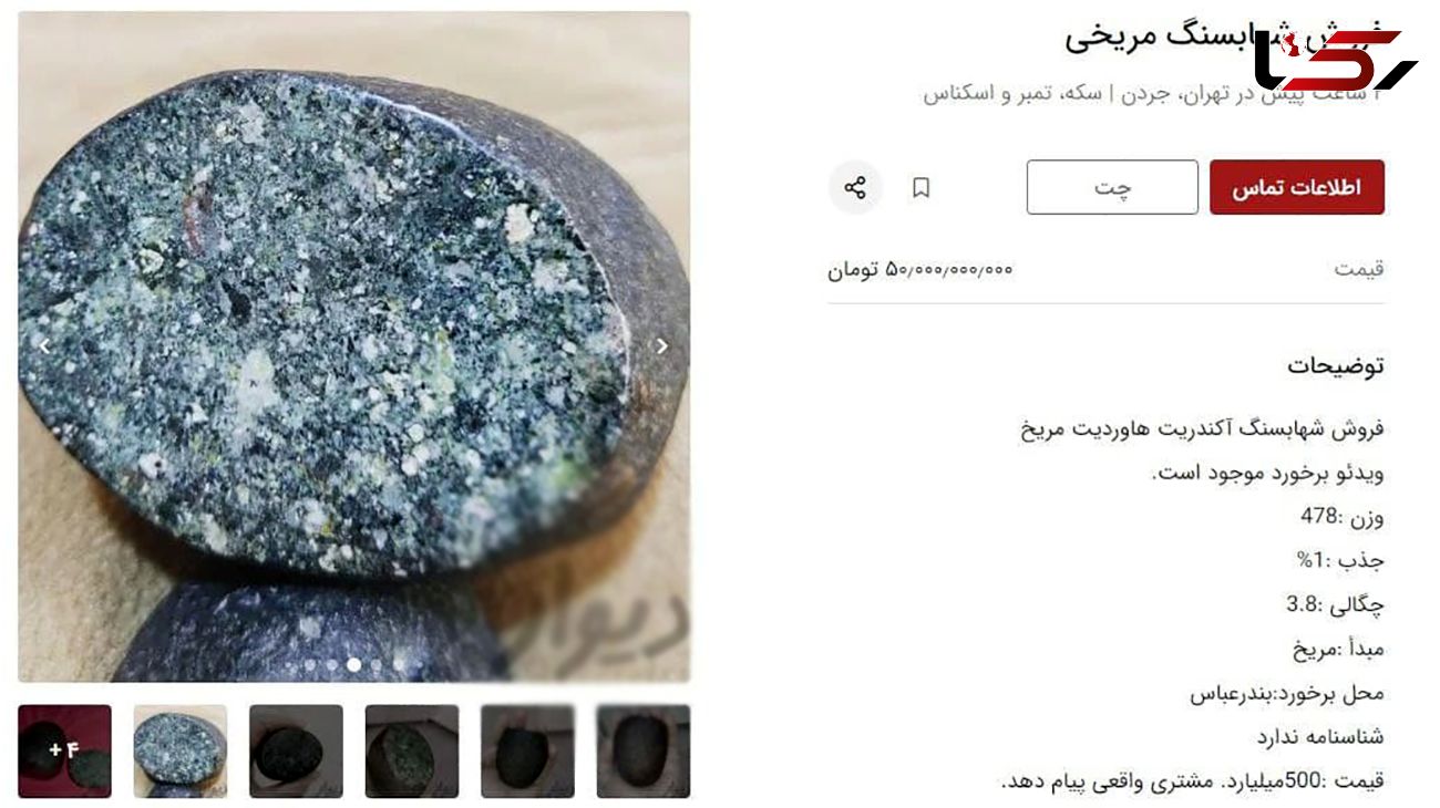 به گزارش رکنا، فروش شهاب سنگ در جردن تهران یک خبر عجیب امروز بود.آگهی فروش شهاب سنگ در دیوار منتشر شده بود.درحالی که در دیوار از شیر مرغ تا جان آدمیزاد پیدا می شود این بار هم شهاب سنگ آگهی شد و منتشر کننده آگهی فروش شهاب سنگ در دیوار آن را منتشر کرد و در تصویر آگهی فروش شهاب سنگ مشخص است.