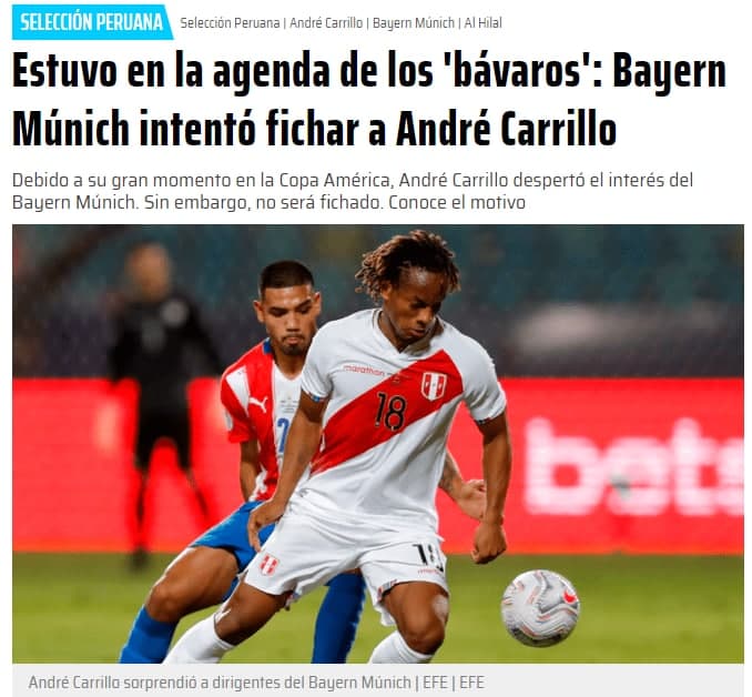 به گزارش "ورزش سه"، روزنامه پرویی libero در خبری مدعی شد که باشگاه بایرن مونیخ قصد به خدمت گیری آندره کاریلو بازیکن حریف استقلال یعنی الهلال عربستان را داشته است ولی در نهایت به دلیل سن بالای این وینگر پرویی، از خرید او منصرف شده است.