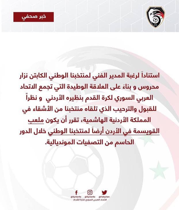 در اطلاعیه ای که فدراسیون فوتبال سوریه صادر کرده، آمده است: بر اساس تمایل مربی تیم ملی کشورمان نزار محروس و براساس روابط نزدیک فدراسیون فوتبال سوریه با همتای اردنی خود و با توجه به پذیرش و استقبال از تیم ما توسط برادرانمان در کشور اردن، تصمیم گرفته شد که استادیوم القویسمة در اردن به  عنوان میزبان بازی های تیم ملی کشورمان در مرحله مقدماتی جام جهانی انتخاب شود.