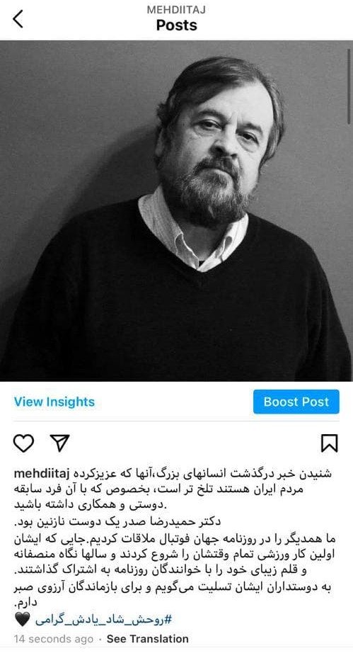 ما همدیگر را در روزنامه جهان فوتبال ملاقات کردیم. جایی که ایشان اولین کار ورزشی تمام وقتشان را شروع کردند و سالها نگاه منصفانه و قلم زیبای خود را با خوانندگان روزنامه به اشتراک گذاشتند. به دوستداران ایشان تسلیت میگویم و برای بازماندگان آرزوی صبر دارم.»
