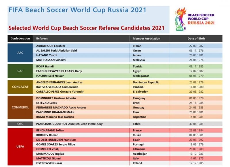 به گزارش "ورزش سه" پس از حضور دو نماینده از ایران برای قضاوت در رقابتهای جام جهانی فوتسال 2021 لیتوانی، حالا با اعلام فیفا، لیست اولیه داوران قضاوتکننده در رقابتهای جام جهانی فوتبال ساحلی 2021 روسیه اعلام شده است که در این فهرست نام 24 داور بینالمللی از 6 قاره به ثبت رسیده است.