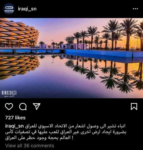 با این حال رسانه های عراقی نوشته‌اند که ای اف سی از فدراسیون فوتبال این کشور خواسته تا کشوری بی طرف را برای میزبانی دیدارهای این تیم معرفی کند که با این وصف کشور عراق صلاحیت میزبانی از مقدماتی جام جهانی را ندارد.