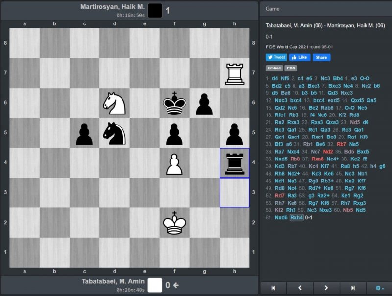 هایک مارتیروسیان، حریف دور پنجم محمدامین طباطبائی در دیدار اول دو شطرنج باز  با مهره سیاه موفق شد تنها نماینده باقی مانده ایران در جدول را شکست دهد تا طباطبایی برای صعود به فکر برد در بازی فردا باشد.