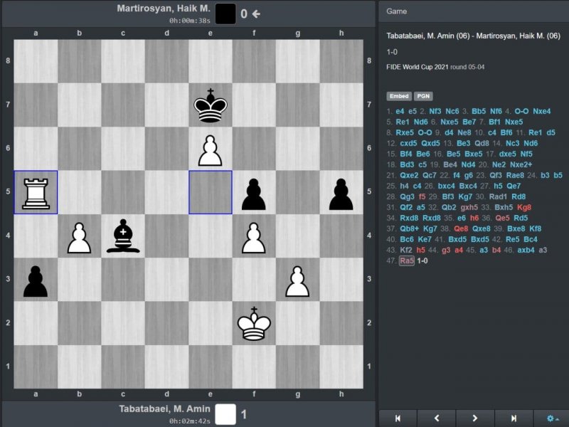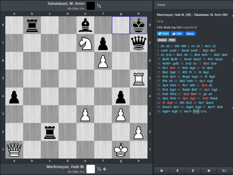 طباطبایی در دیدار اول برابر ماتروسیان به تساوی رسید و بازی دوم را با مهره سفید به نفع خود کرد تا به جمع هشت نفر جام جهانی صعود کرد.