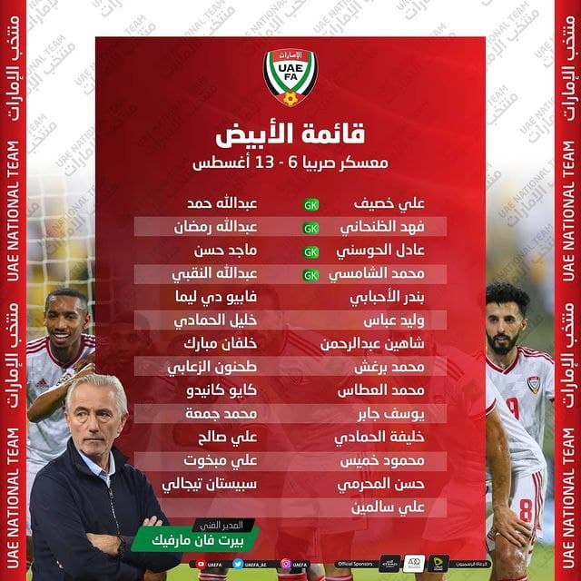 در همین راستا، فن مارویک سرمربی هلندی اماراتی ها، اسامی 27 بازیکن را برای شرکت در این اردو اعلام کرد. او همان لیست قبلی خود را اعلام کرد و تنها روی نام الحسن صالح مدافع شارجه و یحیی نادر بازیکن العین خط قرمز کشیده است.
