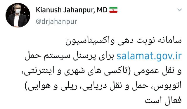 به گزارش بهداشت نیوز، دکتر کیانوش جهانپور در این پیام توییتری نوشته است: «سامانه نوبت دهی واکسیناسیون برای پرسنل سیستم حمل و نقل عمومی (تاکسیهای شهری و اینترنتی، اتوبوس، حمل و نقل دریایی، ریلی و هوایی) فعال است.»