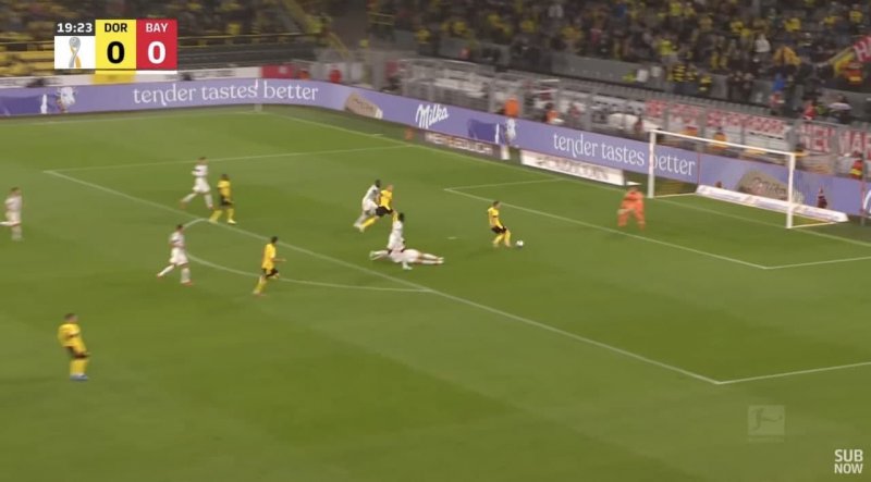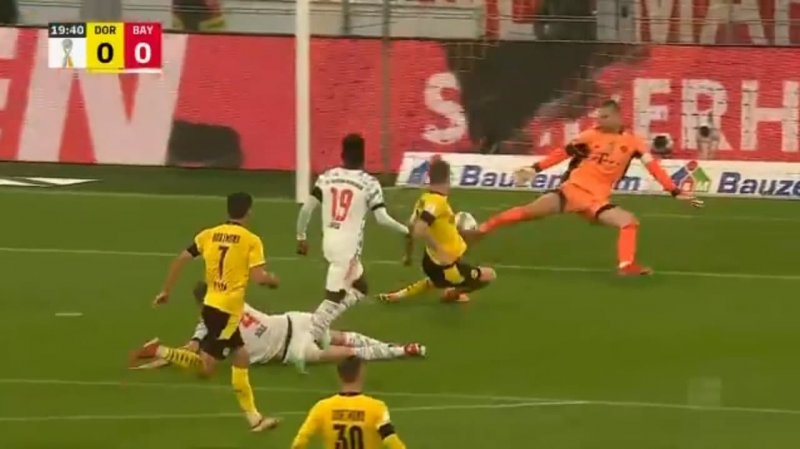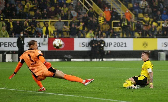 در دقیقه 20 بازی امشب، مارکو رویس در موقعیت تک به تک با مانوئل نویر قرار گرفت؛ در حالی که هواداران دورتموند خود را آماده سر دادن فریاد شادی گل کرده بودند، سوپر سیو نویر جای شادی را برای آنها با حسرت عوض کرد. دروازه بان باتجربه بایرنی ها در این صحنه با پای خود به طرز بسیار زیبای راهی توپ مهاجم حریف را بست.