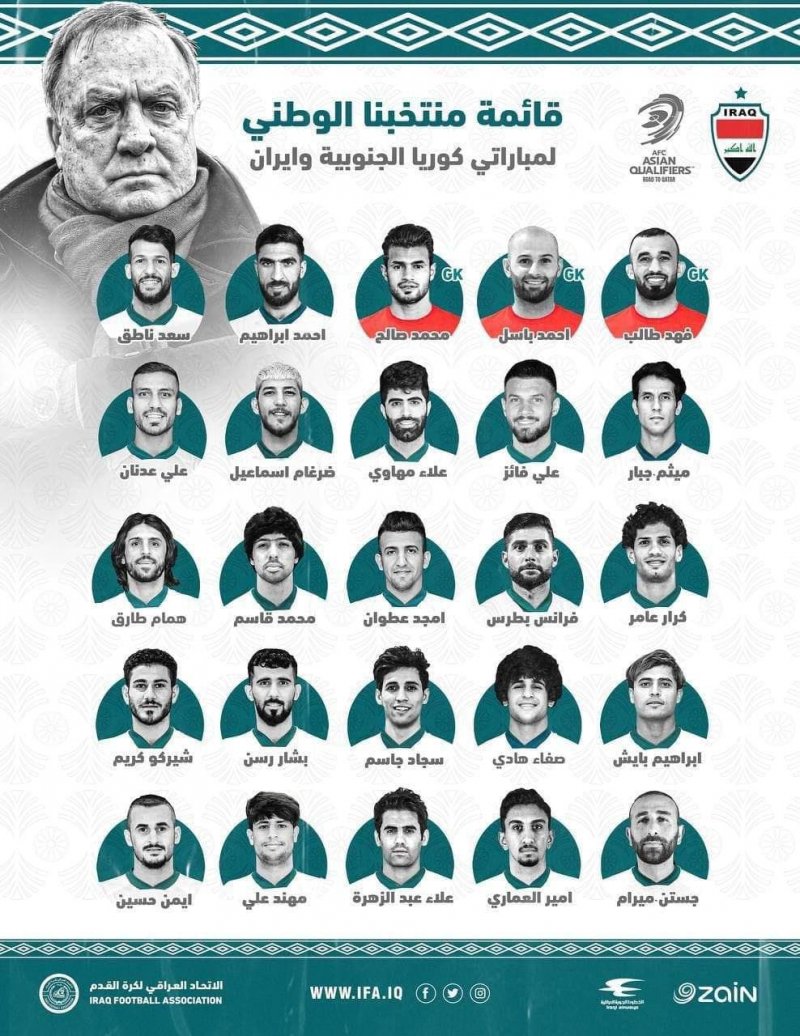 به گزارش "ورزش سه"، پس از پایان اردوی تیم ملی فوتبال عراق در دو کشور اسپانیا و ترکیه، دیک ادووکات سرمربی تیم ملی این کشور، اسامی 25 بازیکن را برای دو بازی ابتدایی خود در مرحله مقدماتی جام جهانی 2022 قطر برابر تیم های ملی کره جنوبی و ایران اعلام کرد.