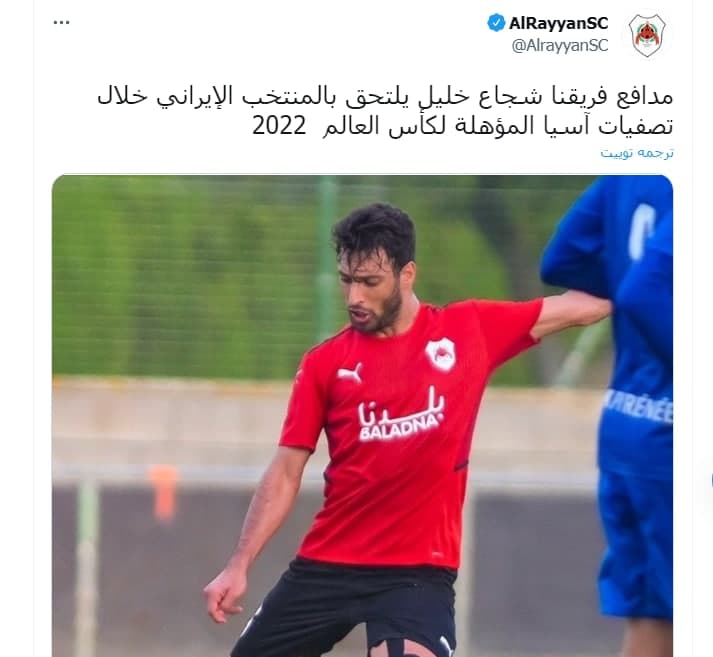 باشگاه الریان قطر با انتشار تصویر و پیامی اعلام کرد شجاع خلیلزاده برای حضور در مرحله مقدماتی جام جهانی ۲۰۲۲ به تیم ملی ایران دعوت شده است.
