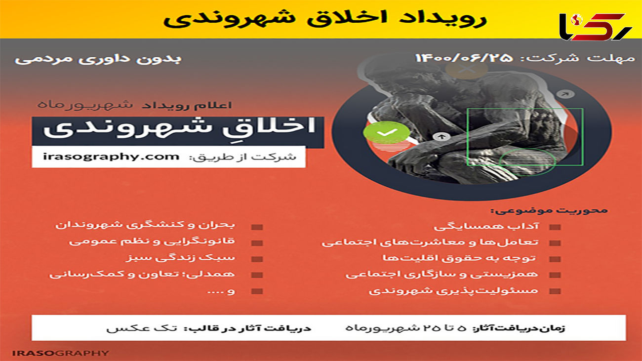 مجموعه ایراسوگرافی که یک موسسه فرهنگی در حوزه عکاسی اجتماعی است اقدام به برگزاری رویداد عکاسی اخلاق شهروندی کرده است. مهلت ارسال آثار برای رویداد عکاسی اخلاق شهروندی تا 25 شهروندان است. تمام مردم ایران حتی با عکاسی با موبایل می توانند در رویداد عکاسی اخلاق شهروندی شرکت کنند. ترویج زندگی مسئولانه تر شهروندی هدف اصلی از برگزاری رویداد عکاسی اخلاق شهروندی است.