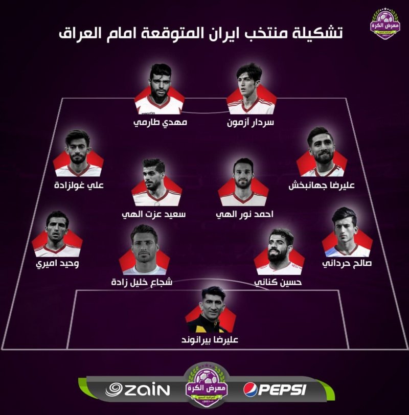 در آستانه این بازی سایت الکوره العراقیه اعلام کرده تیم ملی فوتبال ایران در بازی با عراق با این ترکیب به میدان خواهد آمد؛ با این توضیح که علیرضا بیرانوند مرد شماره یک تیم ملی است. صالح حردانی در جناح راست خط دفاعی و وحید امیری در جناح چپ خط دفاعی به میدان خواهند آمد و طبق پیش بینی شجاع خلیل زاده و محمد حسین کنعانی زادگان دو مدافع میانی تیم ملی فوتبال ایران در مصاف با عراق خواهند بود.