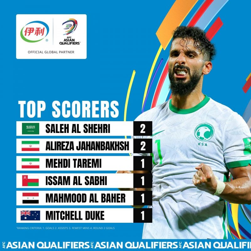 در دو بازی اول صالح الشهری از عربستان و علیرضا جهانبخش با دو گل برترین گلزنان منطقه آسیا هستند. پشت سر این دو تمامی بازیکنان یک گله هستند که مهدی طارمی، عصام الصبحی، محمود البحر و میشل دوک قرار گرفتهاند.
