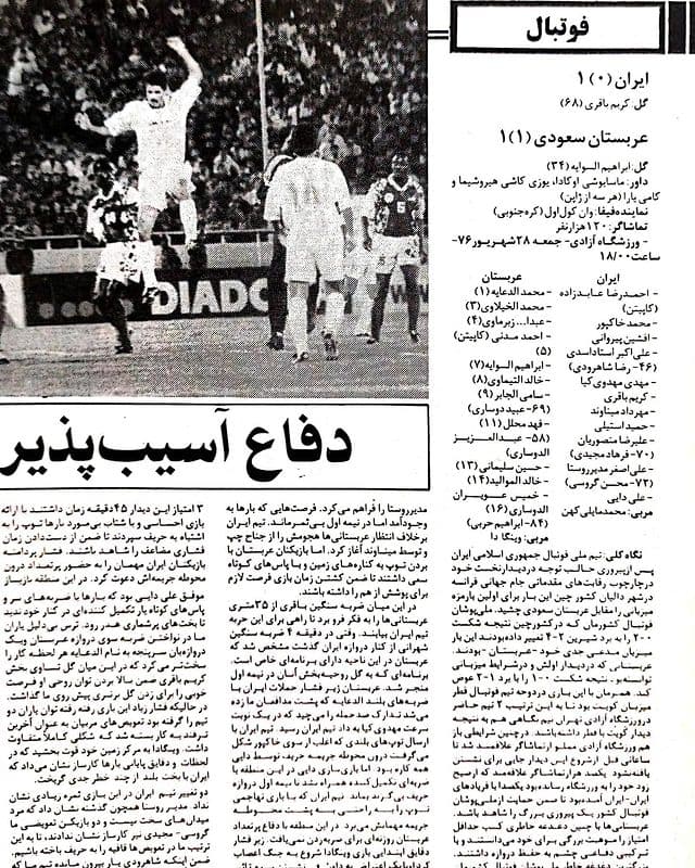 120هزار تماشاگر در روز 28شهریور سال 76 به ورزشگاه بزرگ آزادی آمدند تا نبرد حساس دو تیم ایران و عربستان را از نزدیک ببینند.ایران که شش روز قبل از این دیدار چین را با درخشش مهدی مهدوی کیا و دبلش با چهار گل در هم کوبیده بود ،در تهران شب سختی را برابر عربستان سپری کرد و برابر این تیم با تساوی یک بر یک متوقف شد.