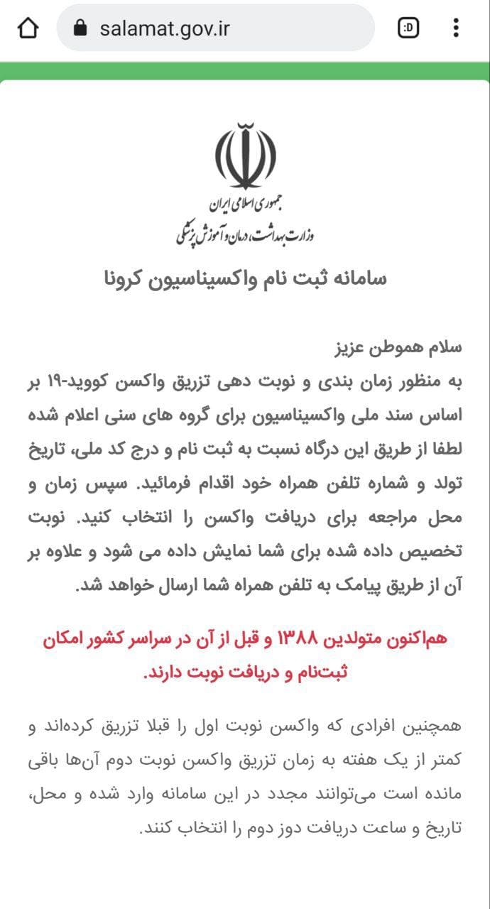 از هماکنون تمامی متولدین ۱۳۸۸ و قبل از آن در سراسر کشور میتوانند از طریق سامانه salamat.gov.ir محل و زمان تزریق واکسن کرونا را انتخاب کنند.