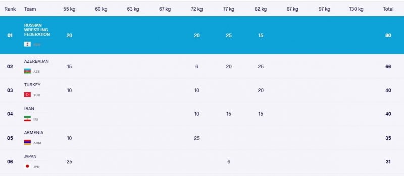 به گزارش "ورزش سه"، تیم ملی کشتی فرنگی ایران در پایان رقابت های 4 وزن اول به دو مدال برنز توسط محمدعلی گرایی در 77 کیلو و پژمان پشتام در 82 کیلو رسید و محمدرضا مختاری هم با شکست در دیدار رده بندی به مقام پنجم دست یافت. این در حالی است که روس ها استارت خود را برای قهرمانی زدند و با یک طلا، دو نقره و یک برنز در پایان روز دوم، با 80 امتیاز صدرنشین هستند. در جدول رده بندی تیمی آذربایجان با 66 امتیاز در رده دوم قرار دارد و ایران و ترکیه با 40 امتیاز در رده سوم هستند.