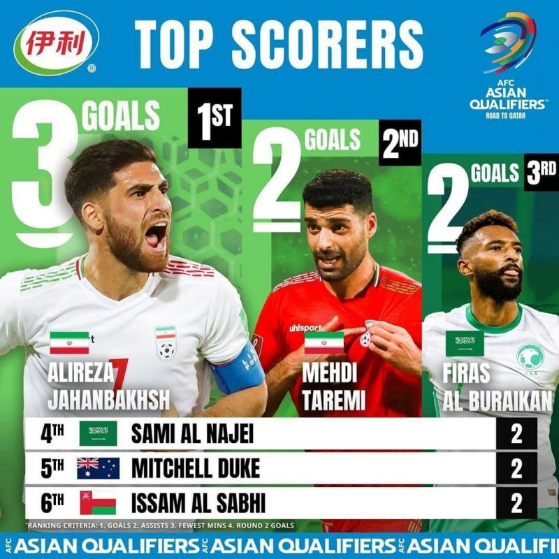 علیرضا با سه گل در رده نخست قرار گرفته و پس از او مهدی طارمی با دو گل قرار دارد. البته بازیکنان پشت سر طارمی در این لیست همه مثل او دو گله هستند اما ملاکهای دیگری مثل پاس گل در کنار گلزنی رتبه آنها را متمایز کرده است. فراس البریکان و سامی الناجی عربستانی نیز دو گل زدهاند؛ میشل دوک استرالیایی و عسام الصبحی از امارات نیز آمار دو گل تا اینجای رقابتها را ثبت کردهاند.