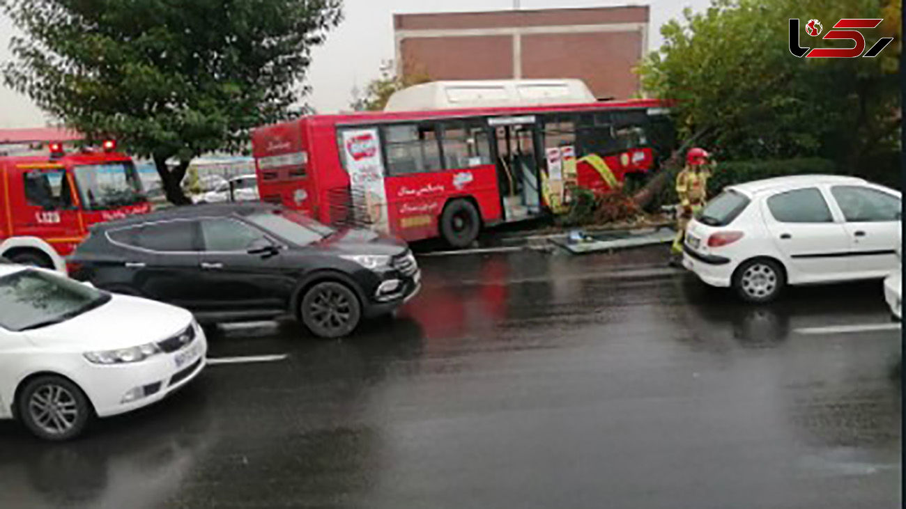 فیلم صحنه تصادف اتوبوس بی آر تی در نیایش / باران صبحگاهی دردسر آفرید