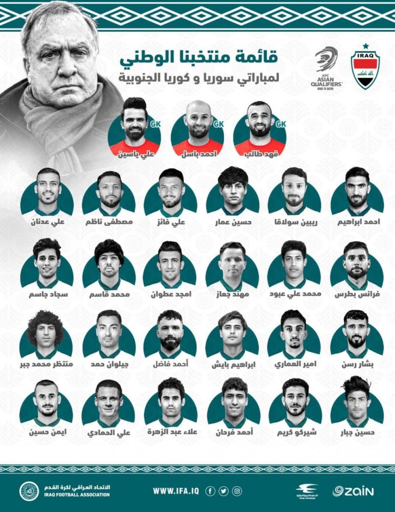 برخلاف اخبار قبلی که اعلام شده بود ادووکات قصد ندارد از علی عدنان دعوت به عمل بیاورد اما نام این بازیکن در فهرست نفرات دعوت شده دیده می شود. 6 بازیکن جدید و جوان نیز به تیم ملی عراق دعوت شده اند.