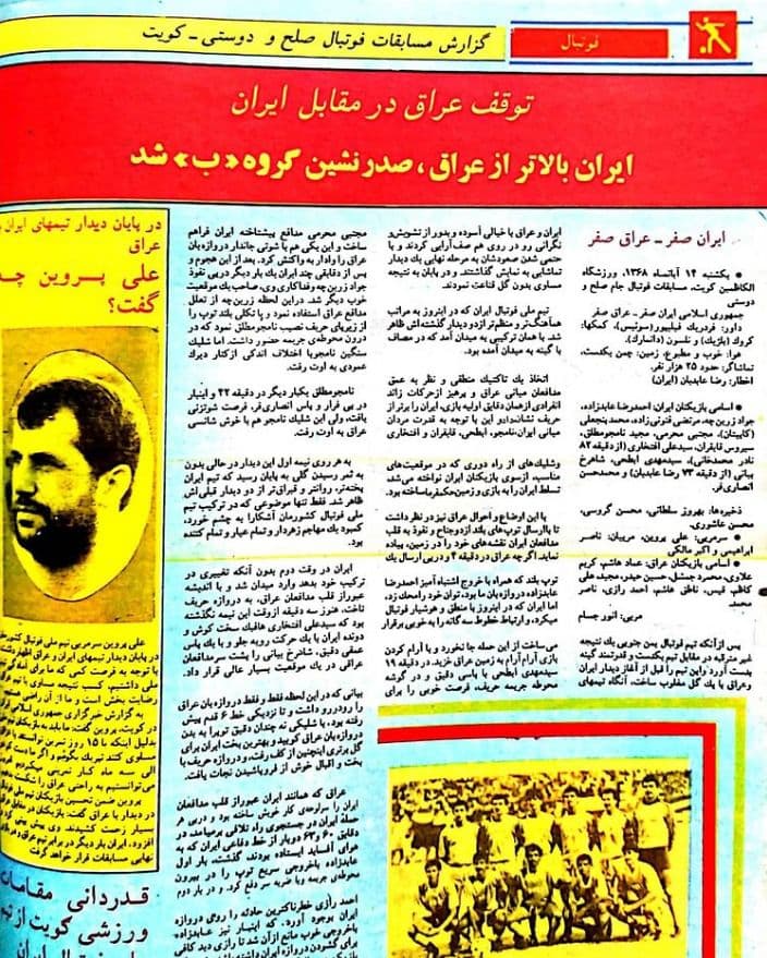 بازی دو تیم در تاریخ 14آبان سال 1368 برگزار شد و دو تیم بعد از 90دقیقه به تساوی بدون گل رضایت دادند. تیم خشن عراق در آن سالها که این خصیصه را هنوز هم بهمراه دارد در روزی که شاهرخ بیانی فرصت تک به تک را در برابر آنها از دست داد و دو موقعیت گلزنی ایران توسط مجید نامجو مطلق روی دروازه عراق از دست رفت، از دست تیم ملی ایران قسر در رفت تا شیرین ترین برد تاریخ، یک سال بعد از آتش بس جنگ تحمیلی نصیب ایران نشود.