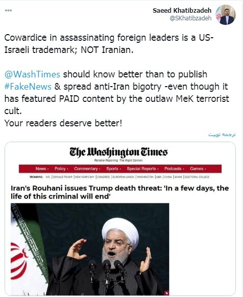 سعید خطیب زاده در صفحه شخصی خود در توییتر نوشت: «بزدلی ترور رهبران خارجی مختص و نشان تجاری آمریکایی - اسراییلی است و نه ایرانی. واشنگتن تایمز باید پختهتر از آن باشد که اخبار جعلی نشر داده و تعصبات ضدایرانی پخش کند - هرچند که این نشریه پیش از این نیز در ازای دریافت پول مطالبی از فرقه تروریستی و غیرقانونی منافقین منتشر کرده است. مخاطبین شما استحقاق مطالب بهتری دارند.»