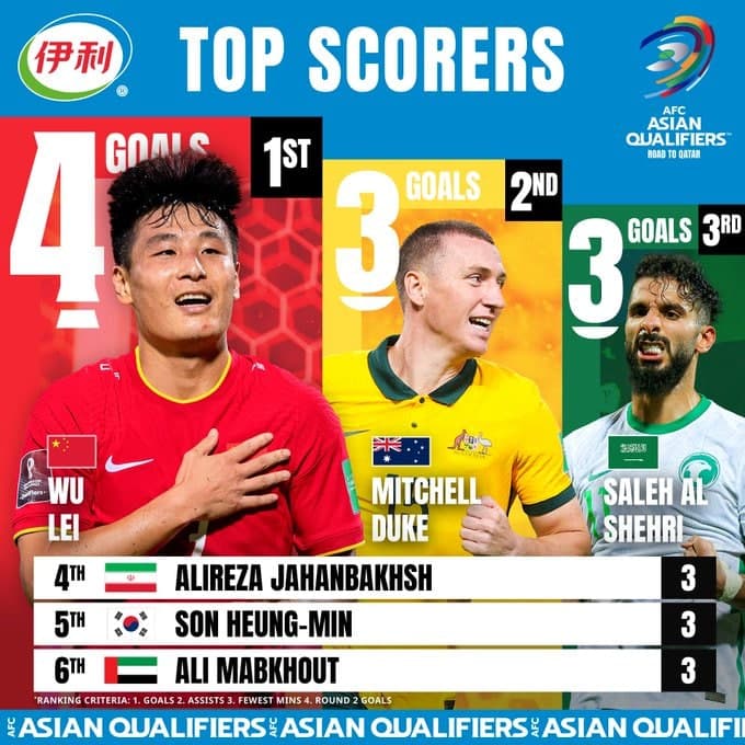 با این حال گلزنی وو لی مقابل استرالیا و درخشش صالح الشهری سبب شد تا این دو جایگاه بهتری در جدول گلزنان داشته باشند. مهاجم تیم ملی چین که پیراهن اسپانیول را برتن دارد، حالا با چهار گل مدعی اصلی آقای گلی محسوب می‌شود و پس از او میشل دوک، صالح الشهری، علیرضا جهانبخش، سون هیونگ مین و علی مبخوت با 3 گل در رتبه بعدی هستند.