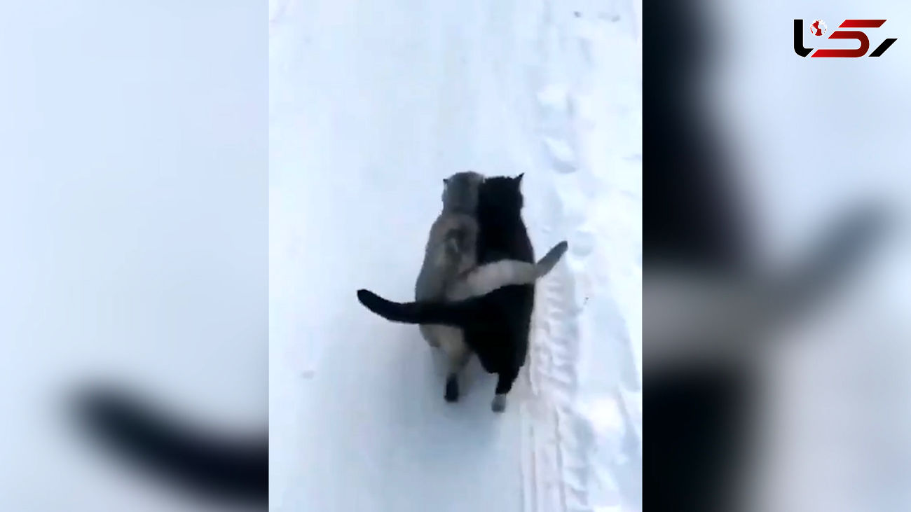 همان طور که در این فیلم مشاهده می کنید بر زمین پوشیده شده از برف این 2 گربه به قدم زدن با یکدیگر پرداختند.
