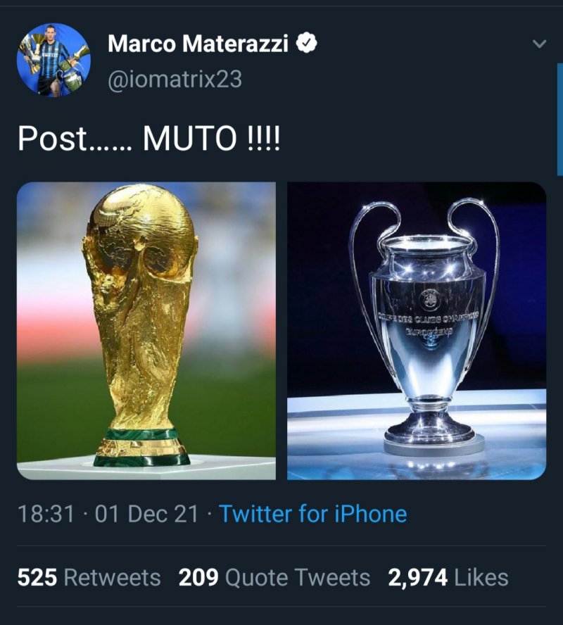 حالا این اظهار نظر زلاتان ابراهیموویچ با واکنش کوتاه و جالب مارکو ماتراتزی همراه شده است. او با قرار دادن عکسی از جام های لیگ قهرمانان اروپا و جام جهانی به نوعی زلاتان ابراهیموویچ را مورد خطاب قرار داده که موفق به فتح هیچ کدام از این دو جام نشده است و به نوعی به این ستاره سوئدی طعنه سنگینی زده است؛ توئیتی که ماتراتزی آن را با عنوان "پست بیصدا" منتشر کرد.