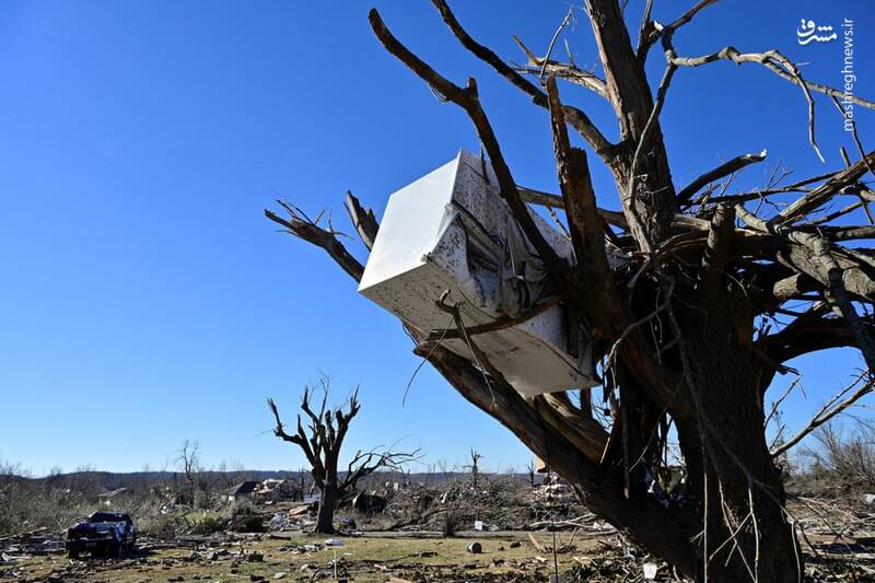 طوفانی با گردبادهای وحشتناک که سرعتی بیش از ۳۰۰ کیلومتر و ارتفاعی ۱۰ کیلومتری داشت به آمریکا تاخت تا جایی که یک یخچال را به بالای درخت پرتاب کرد./عکس: Reuters