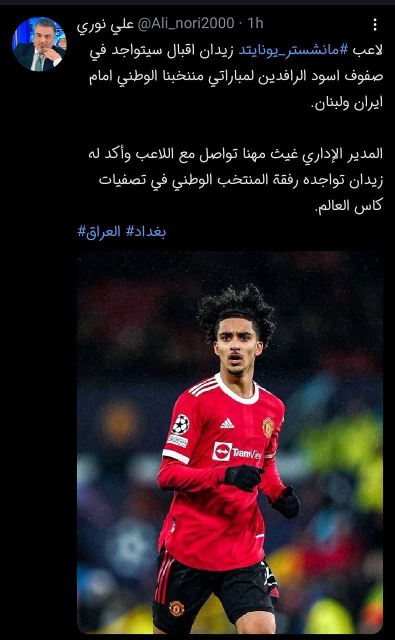 علی نوری خبرنگار مطرح عراقی با انتشار توئیتی در صفحه شخصی خود نوشت: زیدان اقبال بازیکن منچستر یونایتد در دو دیدار تیم ملی کشورمان مقابل ایران و لبنان در جمع شیرهای بین النهرین حضور خواهد داشت. غیث مهنا مدیر تیم ملی با این بازیکن تماس گرفت و زیدان از حضورش در تیم ملی برای دیدارهای مقدماتی جام جهانی، به او اطمینان داد.