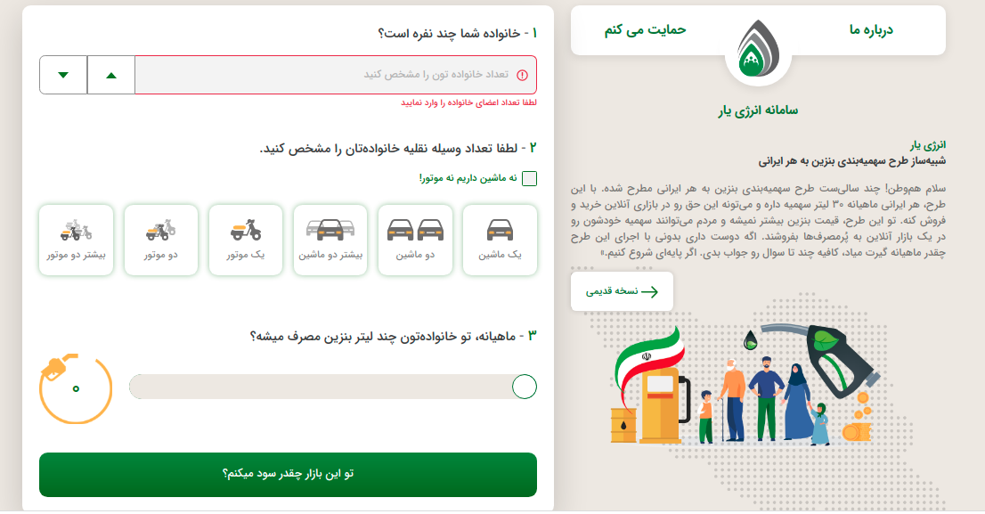از نقاط جالب توجه دراین سامانه این است که بعد از محاسبات یاد شده، اجرای طرح با بنزین 5 هزار تومانی هم پیشبینی شده است. طراحان سایت یک کمپین حمایتی هم برای اجرای این طرح در نظر گرفتند و مخاطبان میتوانند با ورود شماره تلفن خود از اجرای طرح بازتوزیع یارانه بنزین حمایت کنند.