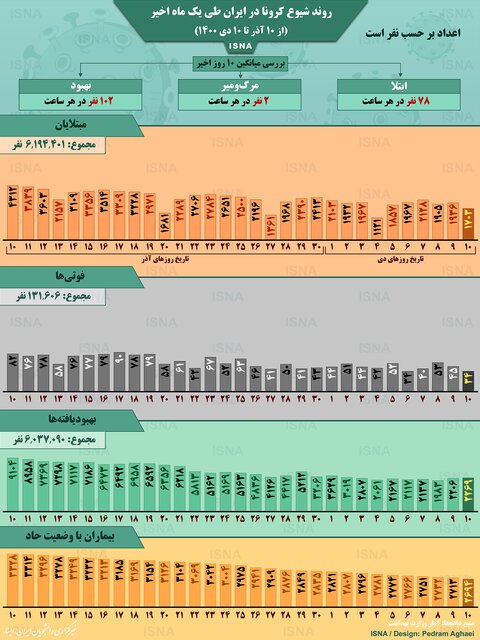 طبق اعلام وزارت بهداشت، ویروس کرونا تا ظهر جمعه (۱۰ دی ۱۴۰۰) شش میلیون و ۱۹۴ هزار و ۴۰۱ نفر را در ایران به طور قطعی مبتلا کرده و در مجموع تا این روز ۱۳۱ هزار و ۶۰۶ نفر را به کام مرگ کشانده است. از سوی دیگر، شش میلیون و ۳۷ هزار و ۹۰ نفر در ایران تاکنون بهبود یافتهاند.