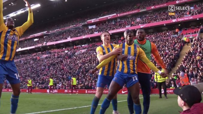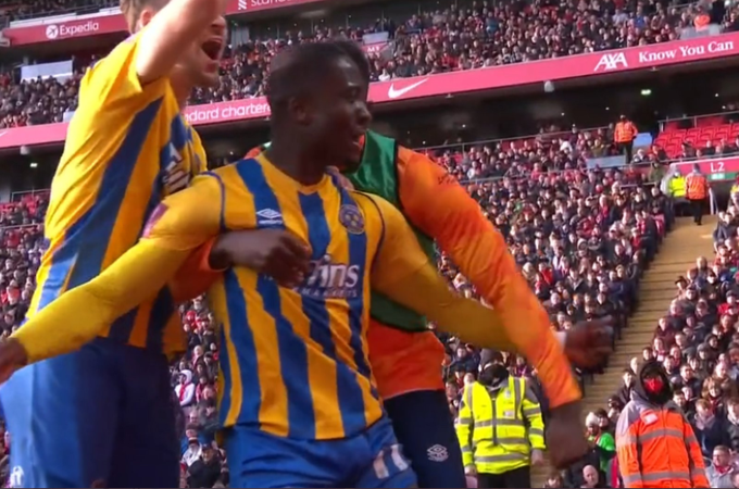 در دقیقه 27 و روی ارسال زمینی و تند و تیز اوگبتا از سمت چپ بود که دنیل اودوه با قطع توپ خوب و ضربه دقیق خود دروازه لیورپول را باز کرد و تیم شروزبری را در استادیوم آنفیلد در مقابل مرسی سایدی ها پیش انداخت.