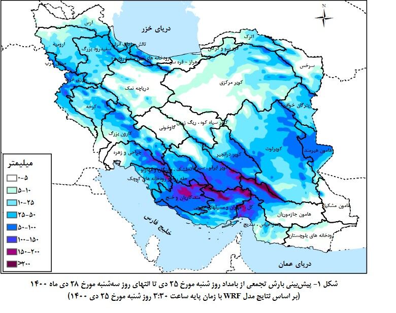روز سه شنبه (۲۸ دیماه) از مجموع حدود ۱۴۵ حوضه آبریز درجه سه، پنج حوضه بارشهای بالاتر از ۱۰۰ میلیمتر خواهند داشت. این پنج حوضه شامل کهورک چاه غیب با حداکثر ۱۶۰ میلیمتر، هلیل رود با حداکثر ۱۴۳ میلیمتر، کویر قطروئیه با حداکثر ۱۰۷ میلیمتر، غرب میناب با حداکثر ۱۱۸ میلیمتر و کل ۱۳۵ میلیمتر هستند.