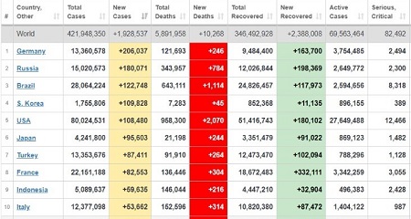 بر اساس این فهرست، آمریکا با ثبت ۲۰۷۰ مورد فوتی؛ برزیل با ثبت ۱۱۱۴ مورد فوتی و روسیه با ثبت ۷۸۴ مورد فوتی در ۲۴ ساعت گذشته به ترتیب در صدر جدول جهانی جان باختگان مبتلا به بیماری کووید-۱۹ قرار دارند.