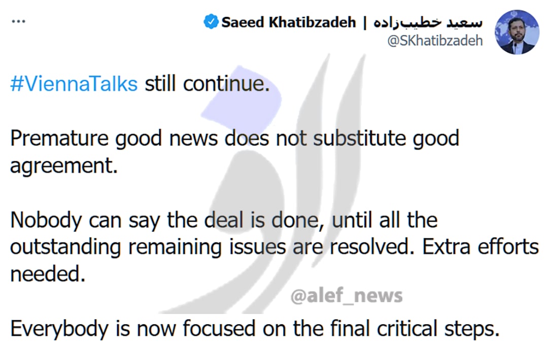 سخنگوی وزارت امور خارجه: گفتگوهای وین همچنان ادامه دارد. اخبار زودهنگام خوب، جایگزین توافق خوب نمیشود. هیچ کس نمیتواند بگوید که توافق انجام شده است، مگر آنکه تمام مسائل مهم باقی مانده حل و فصل شود. تلاش مضاعفی لازم است.اکنون همه بر گامهای کلیدی نهایی متمرکز شدهاند.