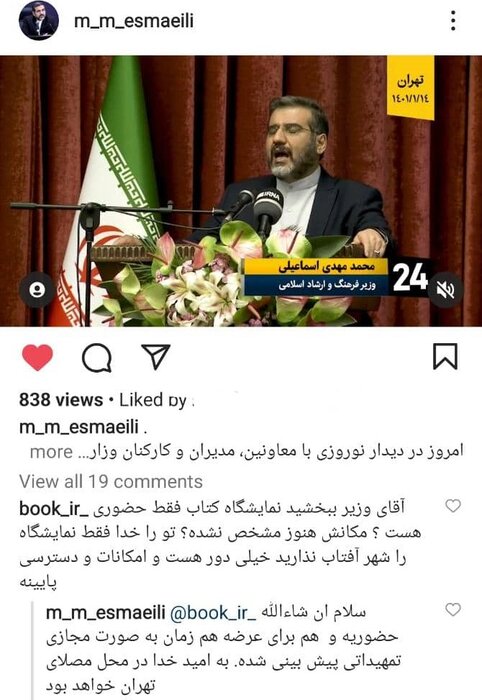 به گزارش خبرنگار فرهنگی ایرنا، این روزها که خبر برگزاری حضوری سی و سومین نمایشگاه کتاب تهران پس از دو سال وقفه، در فضای رسانهای کشور داغ شده و علاقهمندان حوزه فرهنگ و کتاب را سرگردان خبرهای عجیب و غریب از مکان برگزاری نمایشگاه کتاب تهران کرده است، محمدمهدی اسماعیلی، وزیر فرهنگ و ارشاد اسلامی در صفحه اینستاگرام خود باتوجه به خبرهای ضد و نقیض از احتمال برگزاری نمایشگاه کتاب در محل شهر آفتاب اعلام کرد: نمایشگاه کتاب در مصلی تهران برگزار میشود.