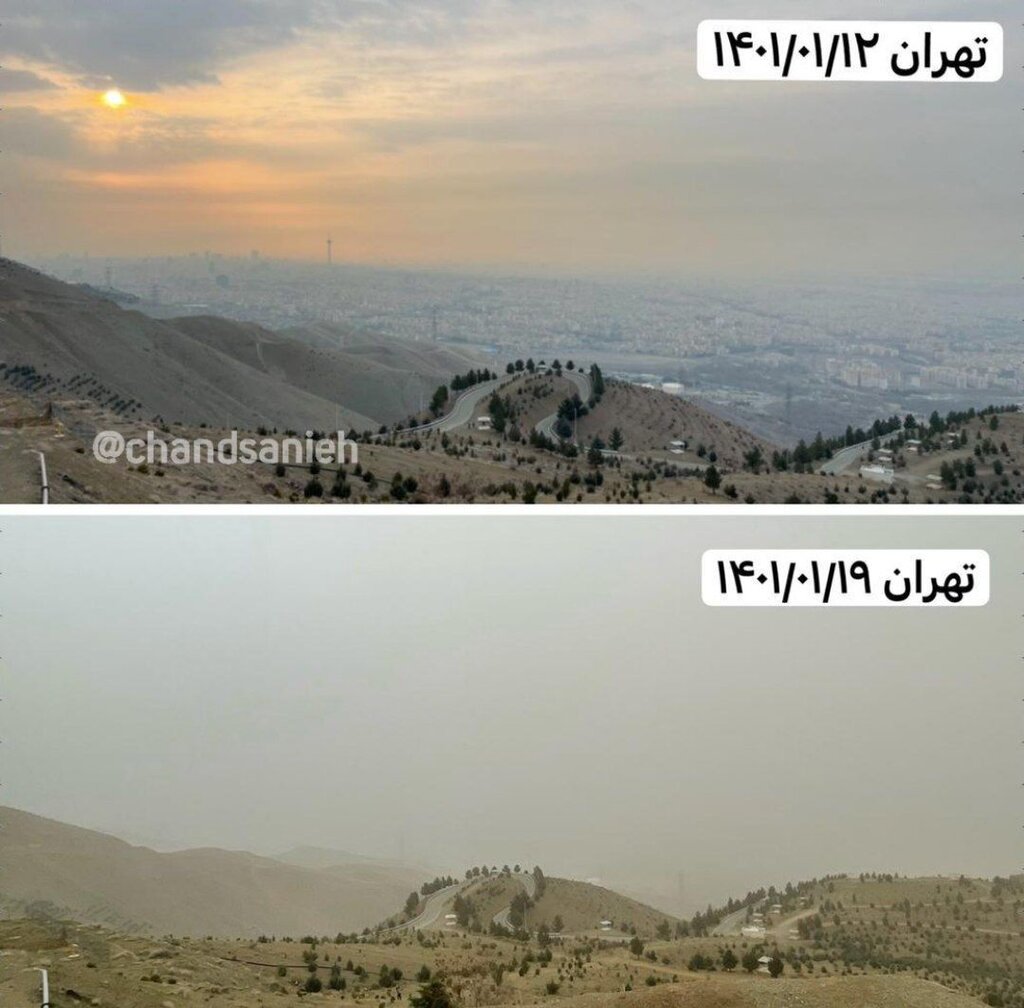 تصویری که یکی از کاربران فضای مجازی از آسمان تهران به فاصله یک هفته منتشر کرده، عمق فاجعه آلودگی هوای امروز پایتخت را نشان میدهد که به دلیل گرد و خاک عراق و سوریه به وجود آمده است.
