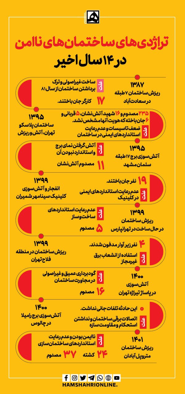 تراژدی‌ ساختمان‌های ناایمن در ۱۴ سال اخیر