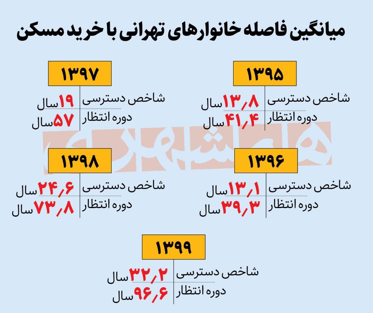 آمارهای منتشر شده از سوی معاونت مسکن و ساختمان وزارت راه و شهرسازی حاکی از این است که شاخص دسترسی مسکن در تهران، براساس نسبت «قیمت مسکن به درآمد خانوار» در سال ۱۳۹۵معادل ۱۳.۸سال بوده و در سال ۱۳۹۹به ۳۲.۲سال افزایش پیدا کرده است.