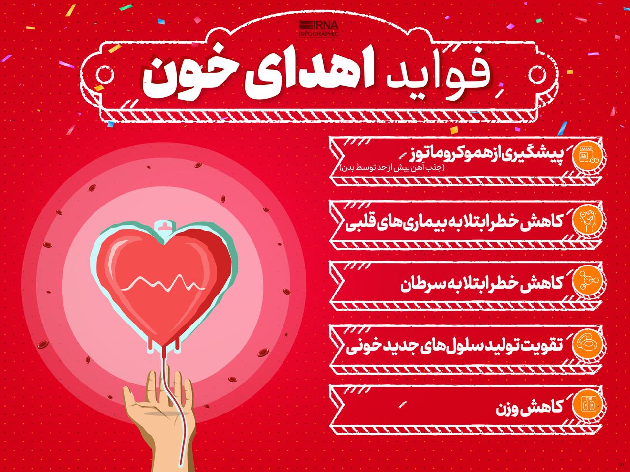 برخی فواید اهدای خون شامل پیشگیری از هموکروماتوز(جذب آهن بیش از حد توسط بدن)، کاهش خطر ابتلا به بیماریهای قلبی، کاهش خطر ابتلا به سرطان، تقویت تولید سلولهای جدید خونی و کاهش وزن میشوند./ایرنا