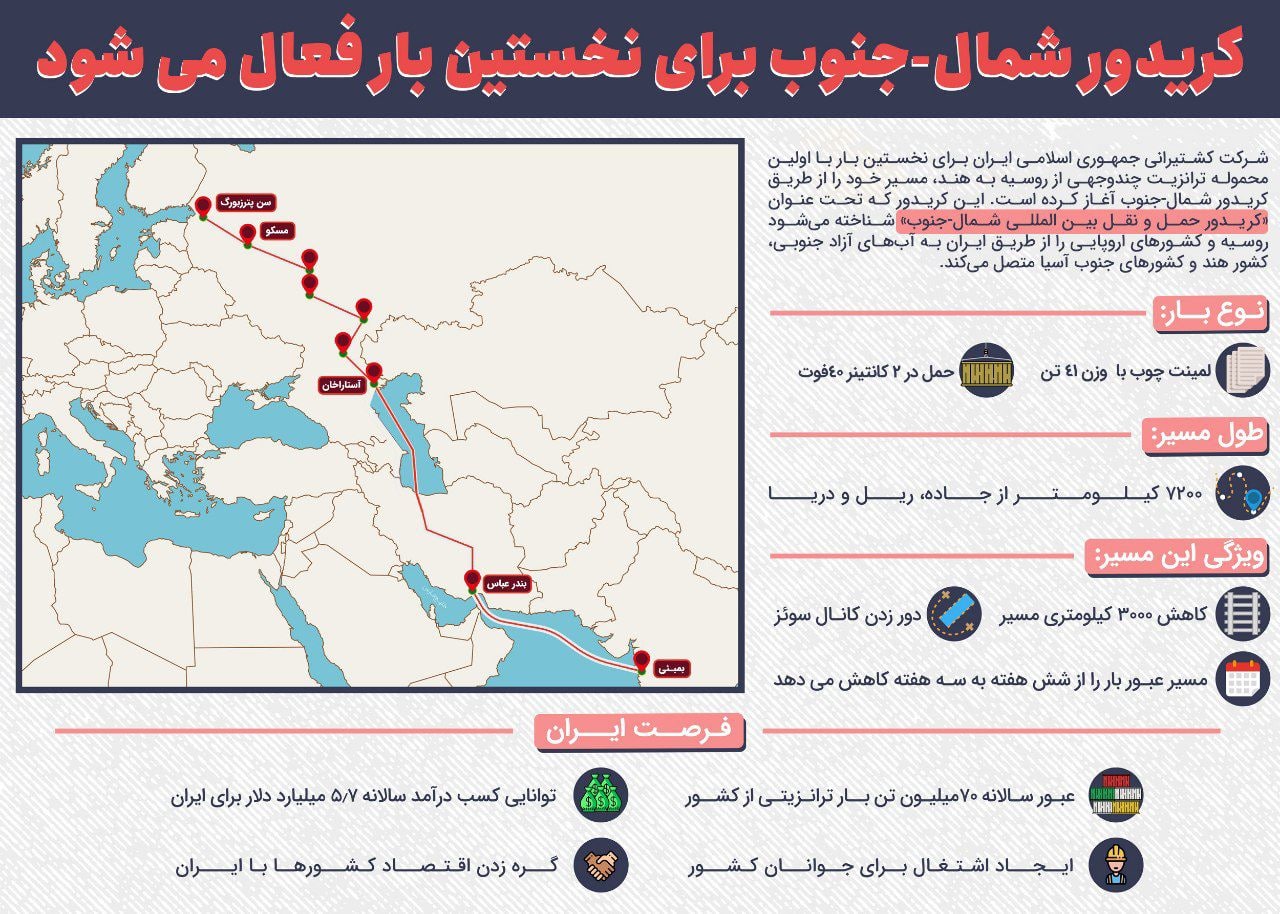 این کریدور که تحت عنوان «کریدور حمل و نقل بین المللی شمال-جنوب» شناخته میشود روسیه و کشورهای اروپایی را از طریق ایران به آبهای آزاد جنوبی، کشور هند و کشورهای جنوب آسیا متصل میکند.