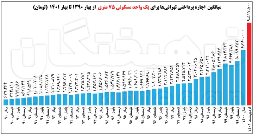 میانگین اجارهبهای هر مترمربع واحد مسکونی در تهران به ۱۲۶ هزار و ۹۰۰ تومان رسیده است. این مقدار به این معنی است که اگر خانوار بخواهد یک واحد مسکونی متعارف ۷۵ متری اجاره کند، باید ماهانه ۹ میلیون و ۵۱۷ هزار تومان اجاره بدهد. رقمی که در سال ۱۴۰۰ حدود ۶ میلیون و ۳۶۰ هزار تومان، در سال ۹۹ حدود پنجمیلیون و ۸۹ هزار تومان و در سال ۱۳۹۸ حدود ۴.۶ میلیون تومان بوده است.