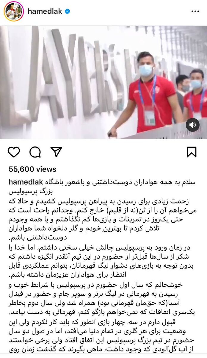 حامد لک با انتشار یک پست در اینستاگرام و همچنین، یک متن نسبتا طولانی به ماجرای جدایی اش از باشگاه پرسپولیس واکنش نشان داد.