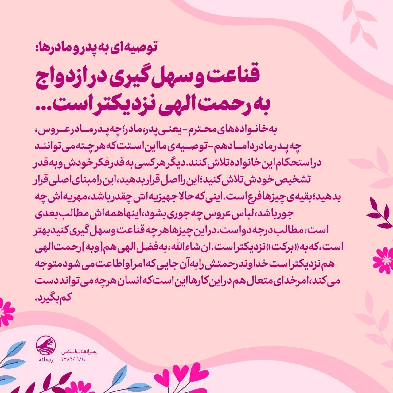 توصیه‌ رهبر انقلاب به پدر و مادرها: قناعت و سهل‌گیری در ازدواج به رحمت‌ الهی نزدیک‌تر است