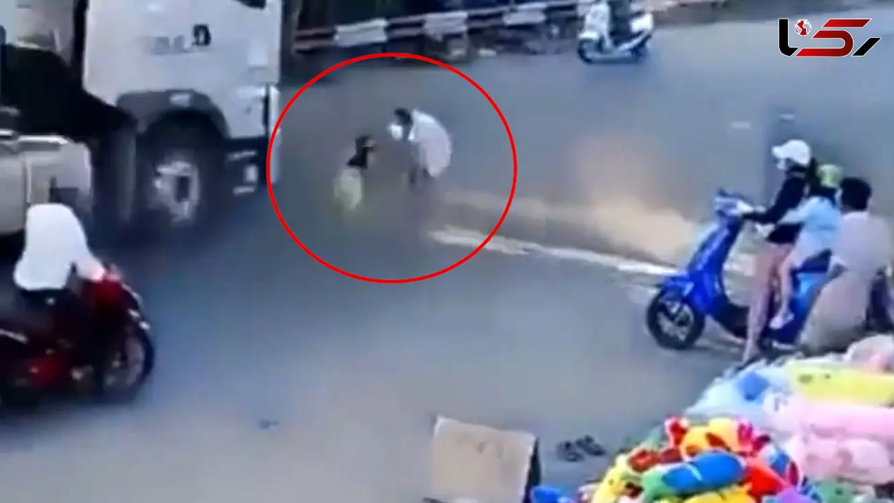 رکنا: پسر بچه در حال عبور از خیابان بود که مرد جوان با دیدن این صحنه و قبل از اینکه او زیر چرخ های تریلی برود به کمکش رفت.