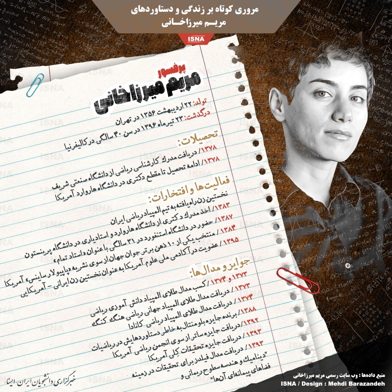 مریم میرزاخانی، ریاضیدان و دانشمند و نابغه ایرانی، بیست و سوم تیرماه در سن ۴۰ سالگی از دنیا رفت. او نخستین زن راهیافته به تیم المپیاد ریاضی ایران بود و در کارنامهاش افتخارات زیادی از جمله مدال طلای المپیاد دانشآموزی ریاضی، مدال طلای المپیاد جهانی ریاضی هنگکنگ، مدال طلای المپیاد ریاضی کانادا، جایزه ساتر از سوی انجمن ریاضی آمریکا، جایزه تحقیقاتی کِلی آمریکا و از همه مهمتر، دریافت مدال معتبر فیلدز به چشم میخورد.
