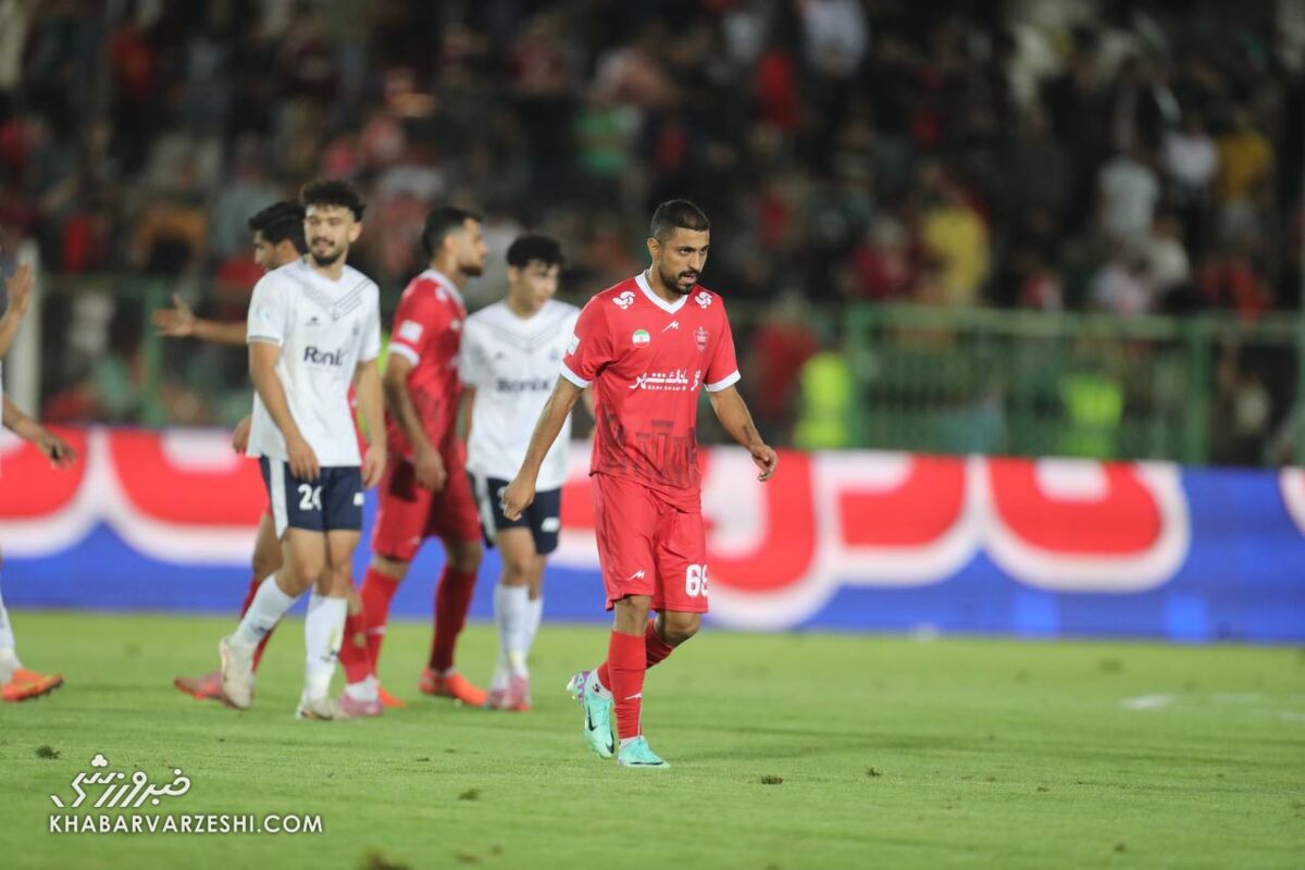 شوت از راه دور محمد آبشک با اختلاف از بالای دروازه پرسپولیس عبور کرد.